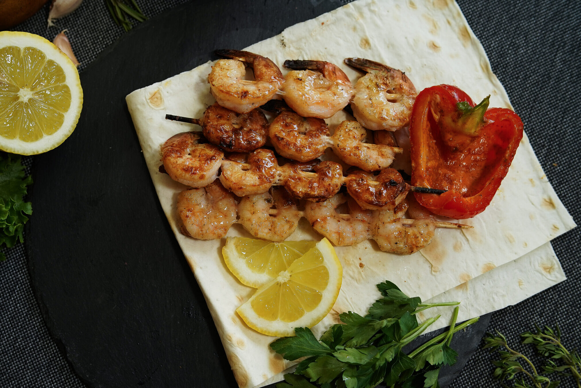 креветки; красный перец.; лаваш; лимон/зелень.