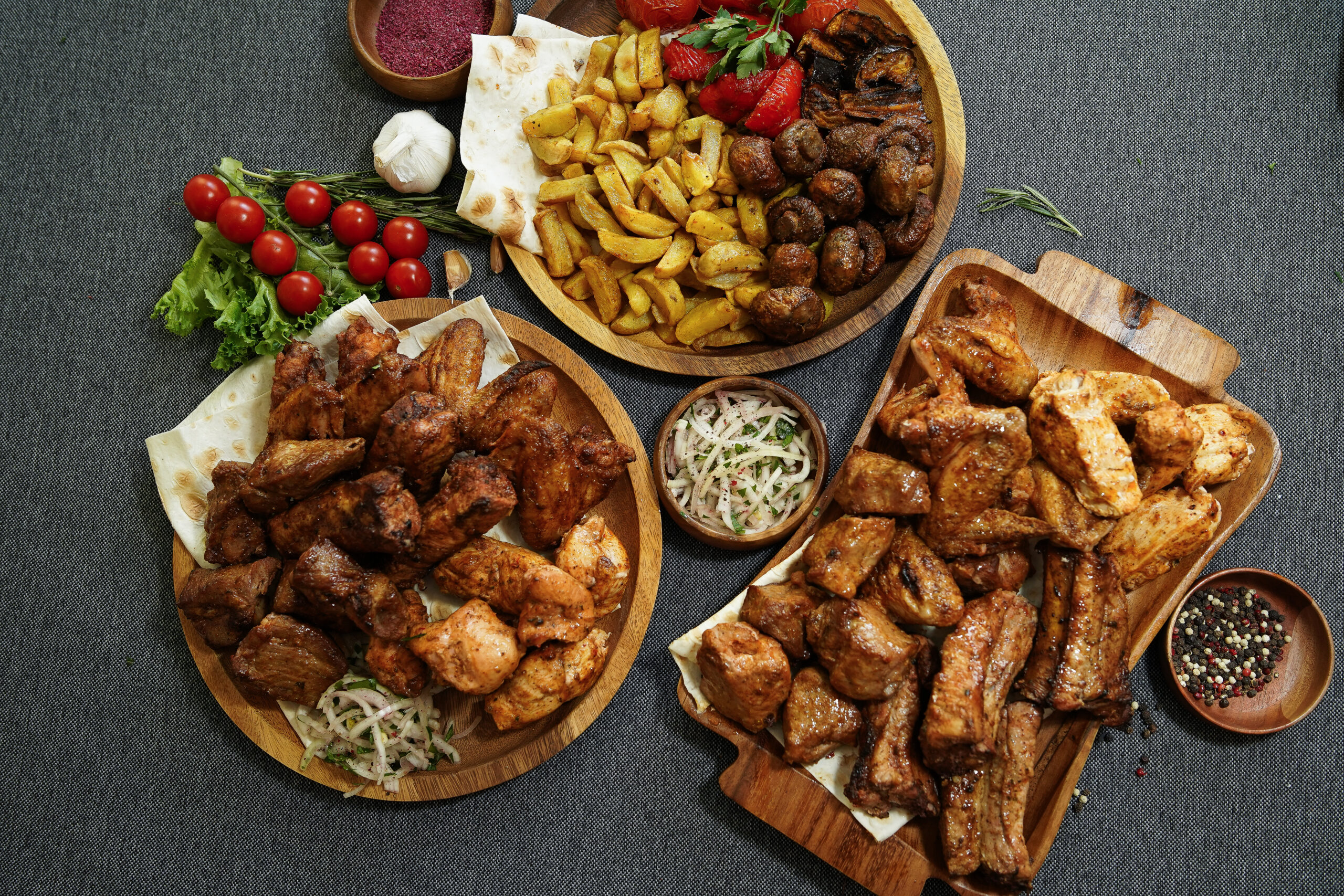 свиная шея – 800 гр.; свиные ребра – 800 гр.; филе – 800 гр.; крылья – 800 гр.; картофель – 800 гр.; овощи «Микс» — 400 гр.; шампиньоны – 250 гр.; лаваш.; напиток — 2 л.; соус – 6 шт.