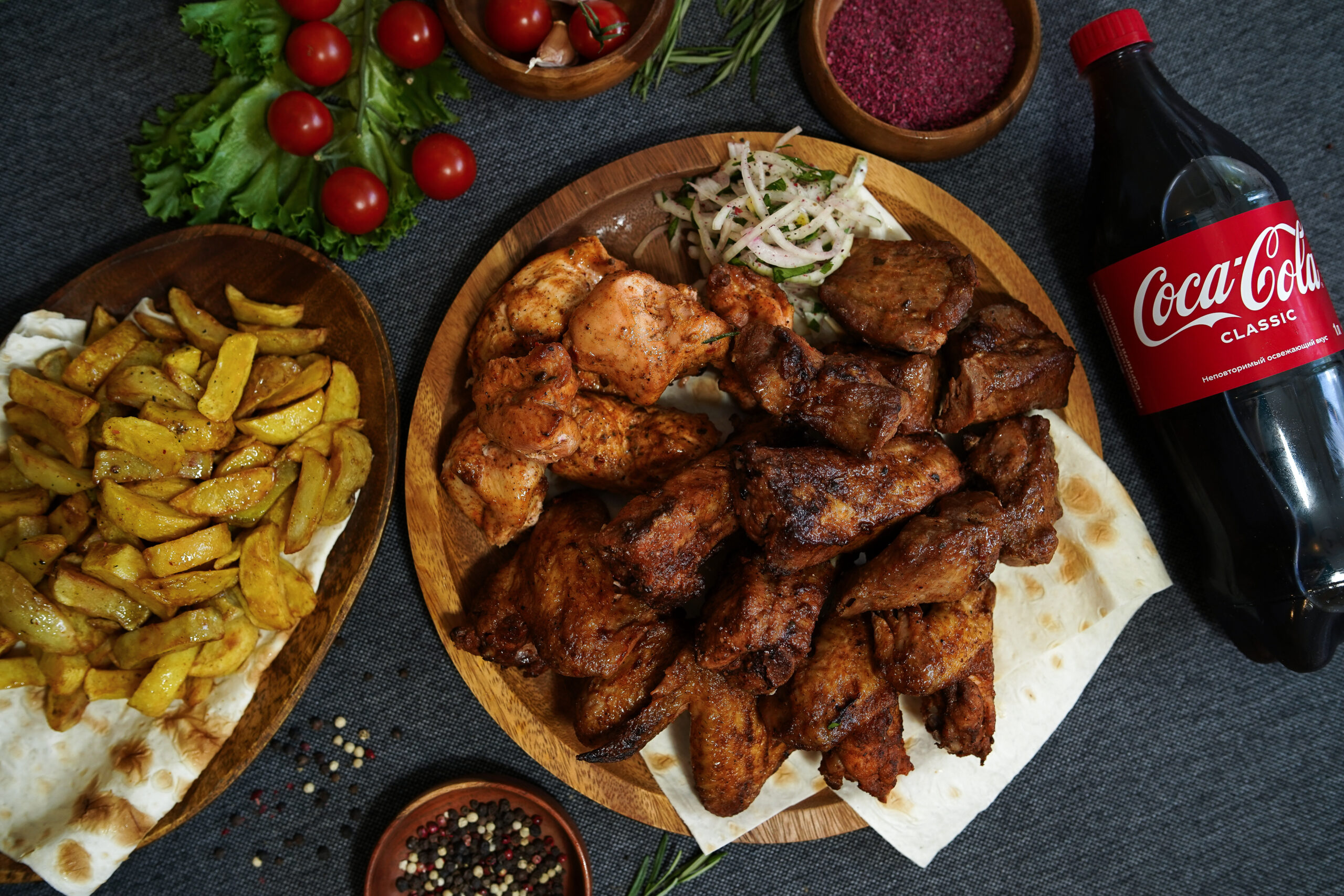 шея – 400 гр.; ребра – 400 гр.; филе – 400 гр.; крылья – 400 гр.; картофель – 400 гр.; лаваш.; напиток — 1л.; соус – 4 шт.
