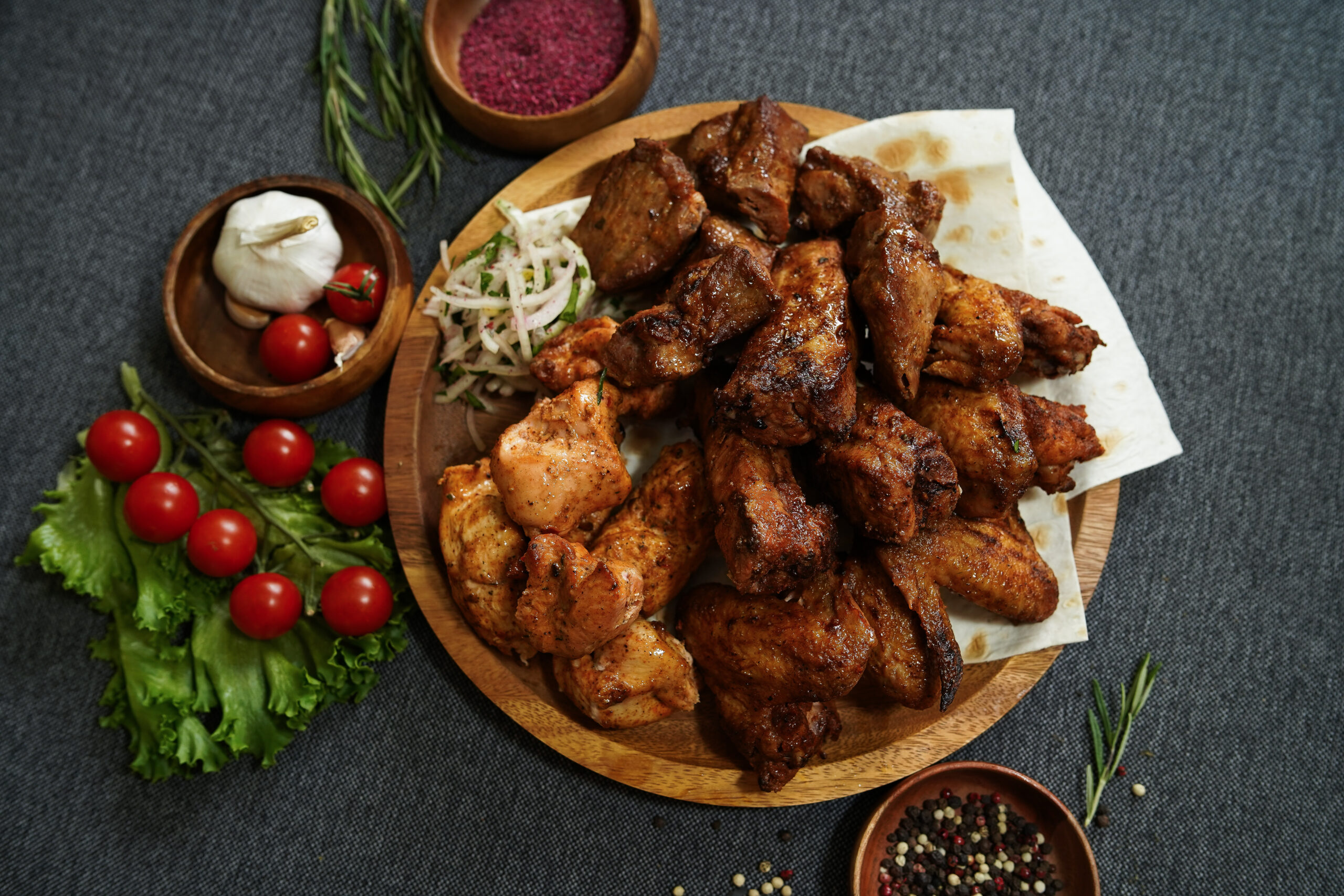 Свиной шашлык (шея) – 400 гр.; ребра – 400 гр.; филе – 400 гр.; крылья – 400 гр.; соус – 3 шт, лаваш.